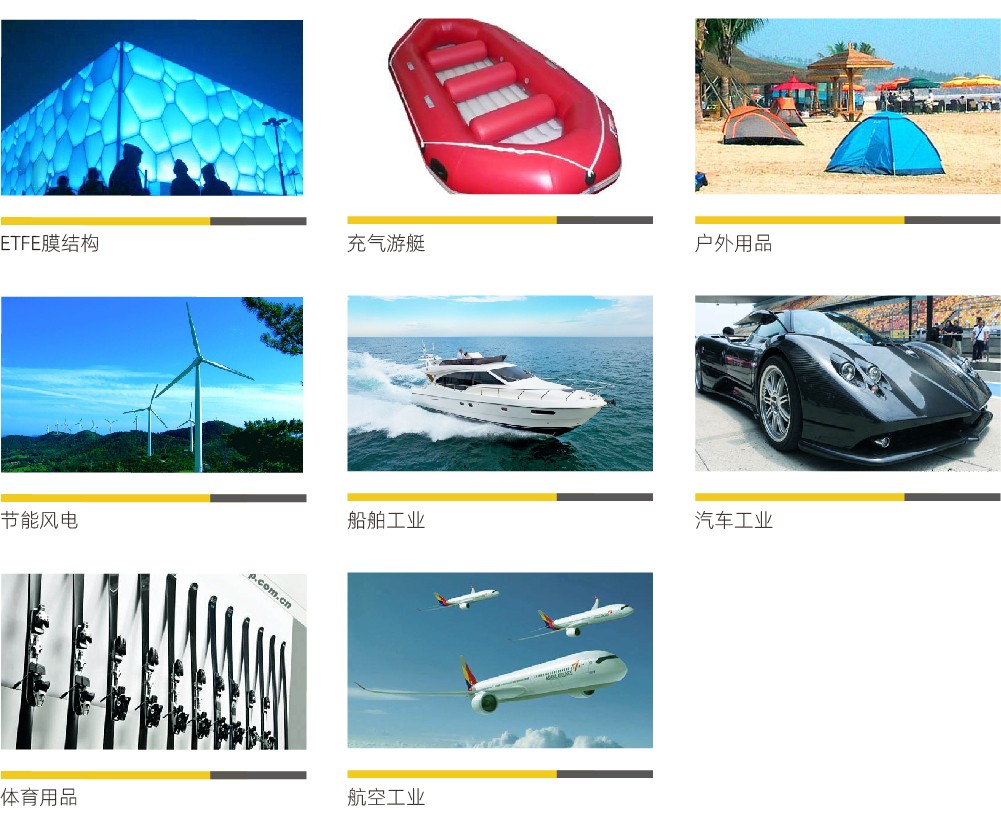 適用行業(yè):復合材料、家具內(nèi)飾、汽車內(nèi)飾、氣模制品、紡織服裝、膜結(jié)構(gòu)、充氣游艇、戶外用品、節(jié)能風電、船舶工業(yè)、體育用品、航空航天